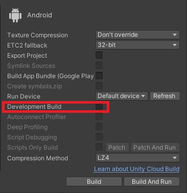 이 부분은 간단하게 참조 주소에서 처럼 Development Build 체크를 해제한 후에 빌드해주면 된다.